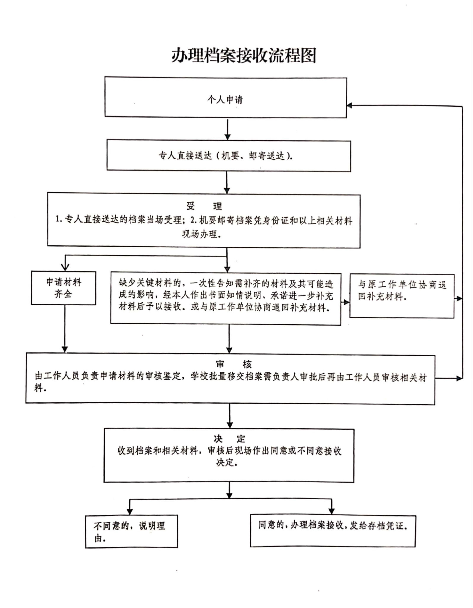 符合接收条件的,办理人事代理手续,缺少关键材料的,经本人做出书面知情说明、承诺进一步补充材料后予以接收,或退回原单位补充材料。