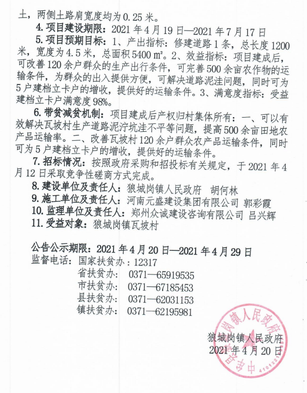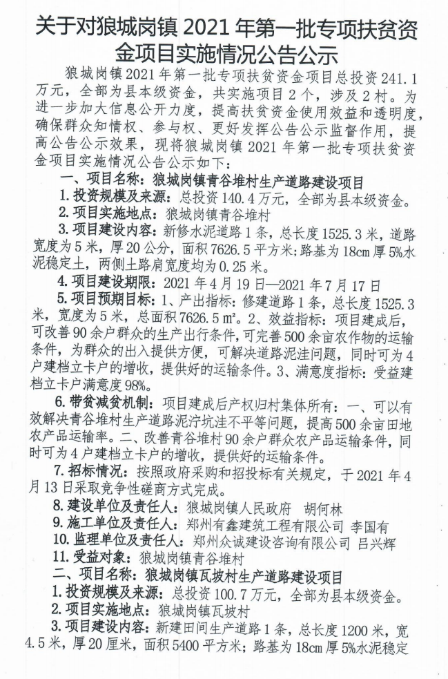 关于对狼城岗镇2021年第一批专项扶贫资金项目实施情况公告公示